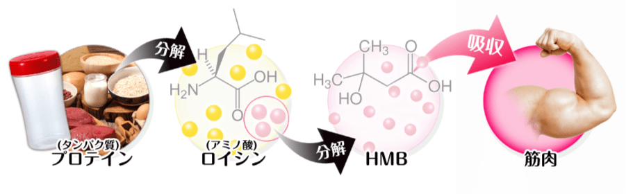『HMB』は、この「プロテイン」を摂取すると体内でアミノ酸に分解され、筋肉に効果的とされる「ロイシン」という成分が作られます。
